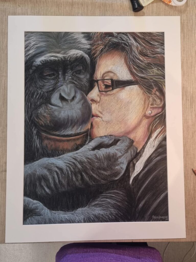 Om någon köper porträttet av Santino och mig lovade Erica att donera de pengarna till Sweden Chimpanzee Trust.